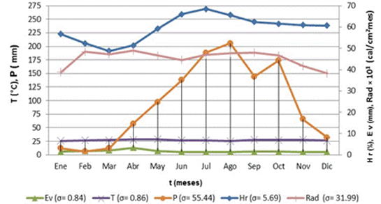 En la Figura 2 se representa el comportamiento mensual de la temperatura, la precipitación, humedad relativa, evaporación y radiación a partir de 16 años de registros meteorológicos (1998-2014). Entre paréntesis se muestra el valor de desviación estándar. La temperatura media mantiene una tendencia relativamente constante, sus valores promedios máximos (28,68 ºC) y mínimos (25,27 ºC), apenas fluctúan alrededor de dos grados, encontrándose estos valores espaciados en un rango de 10 años. Un comportamiento más irregular se observa para la humedad relativa, cuyos picos extremos se asocian a los períodos en que se suceden las variaciones extremas inherentes a las precipitaciones.
