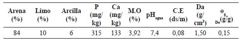 El suelo del área bajo estudio (Figura 1) clasifica en el orden Entisol, subgrupo Quarzipsamments (USDA Soil Taxonomy) y Arenosols (World Reference Base), se correlaciona con los Suelos Poco Evolucionados de la Clasificación Genética de los suelos de Cuba (Hernández et al., 1999). En su caracterización (600 m2 de la casa de cultivo) se evaluaron aspectos como la homogeneidad, pendiente y la cobertura vegetal. Un muestreo en forma de zigzag a lo largo y ancho del terreno apoya la determinación de la Tabla 1, realizadas en los laboratorios de suelos del INIA.