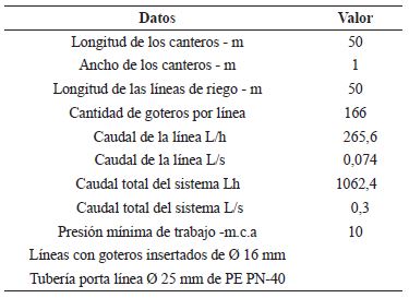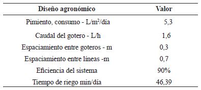 Los cálculos del diseño agronómico e hidráulico están hechos a partir del cultivo del pimiento que es uno de los más exigentes, así como para el periodo de máxima demanda, estos resultados se muestran en la Tabla 10. Otro elemento tenido en cuenta es la calidad del agua para el riego de la región, la cual no tiene altos contenidos de calcio permitiendo el funcionamiento eficiente de los goteros.