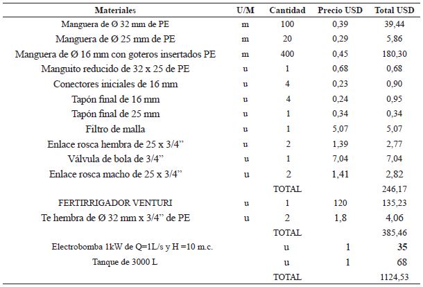 En las Tablas 11 y 12 se muestran los cálculos del diseño hidráulico enfocado en la casa de cultivo dela Universidad Politécnica Territorial “José Antonio Anzoátegui” y relación de materiales, cantidad y precios relacionados con la propuesta del sistema de riego para casas de cultivos protegidos.