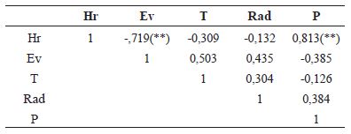 La temperatura y la humedad relativa denotan un comportamiento inverso, es decir, mientras la humedad relativa exhibe una tendencia al aumento, la temperatura apunta a disminuir. El resultado de la Tabla 3 justifica, tentativamente, las tendencias temporales inversas entre la humedad relativa y la temperatura, otros análisis de correlación corroboran el nexo existente en la práctica entre las variables meteorológicas implicadas, lo cual puede arrojar criterios acerca de los manejos presentes y futuros en ambiente controlados.