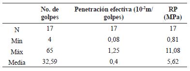 La resistencia a la penetración (RP) fue medida con el penetrómetro dinámico de cono (PDC) de punta cónica con área de la base 5,06 x10-04 m2, ángulo del cono de 60°, distancia de caída libre de 0,6 m y masa total y de impacto de 7 y 2,3 kg, respectivamente. Se registraron lecturas del número de golpes hasta los 30 cm de profundidad, donde las condiciones del suelo así lo permitían. Las lecturas obtenidas fueron traducidas a valores de RP mediante la formulación 1 citada por Stolf et al. (2005), evaluada para suelos de la región por García et al. (2016).