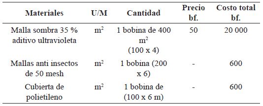 La malla esta tejida con monofilamentos fuertes producidas con un material especial resistente a los rayos ultravioletas, lo que le proporciona una larga vida; es reforzada en los bordes, flexible, liviana y fácil de extender. Estas mallas no deben necesariamente tener carácter permanente, o sea deben ser plegables, puesto que coadyuva a contralar la temperatura que de conjunto con la escasez de elementos estructurales dentro de la casa favorece el desarrollo de labores mecanizadas. En la Tabla 6, tentativamente se relacionan el listado de materiales, cantidades y precios al momento del estudio. Las características del polietileno que obedece a este precio son: multicapa de 200 micras, con aditivos ultravioleta y color transparente lechoso.