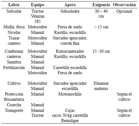 Teniendo en cuenta las condiciones específicas que influyen en los medios técnicos, en especial el tamaño de las naves y tipos de cultivo protegido, espacios libres para el trabajo de los equipos, disponibilidad de mano de obra, etc. se definieron las labores a realizar, los aperos o máquinas para cumplimentar los trabajos y las posibles fuentes energéticas, ello toma como referentes experiencias de investigadores cubanos (Villarino et al., 2007).