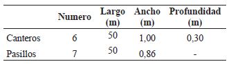 A partir de las dimensiones de la casa de cultivos (12 x 50 m) y de su particularidad de no contar en su interior con elementos estructurales que constituyan barreras, se realizan los cálculos para determinar el número y dimensiones óptimas de los canteros y pasillo, lo cual se ilustra en la Tabla 9.