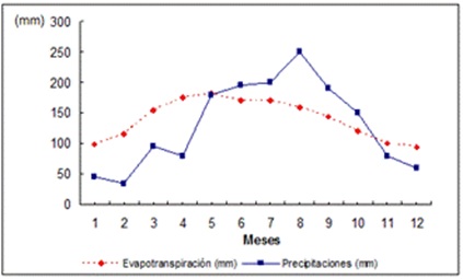 Los datos climáticos fueron tomados de la estación meteorológica localizada en el área experimental. El clima se caracteriza por una media anual de precipitaciones que alcanza los 1 531 mm, de los cuales el 68% (1 044,4 mm) se distribuyen entre los meses de mayo y octubre, correspondientes al período lluvioso y el restante 32% (486,4 mm) corresponden al período seco, que se extiende desde el mes de noviembre hasta el mes de abril (Chaterlán, 2012). Durante el período seco el balance de lluvia y evapotranspiración potencial de la zona es negativo por lo que el riego es imprescindible para la obtención de buenos rendimientos agrícolas (Figura 1).