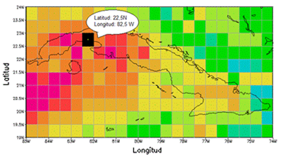Para la obtención de estos datos se hizo uso de los valores climáticos del modelo regional PRECIS, este modelo, desarrollado por el Centro Hadley del Reino Unido, presenta una resolución de 25 x 25 km2, que según Planos et al. (2013), ha permitido representar el clima futuro en pequeños países. Del PRECIS se tomaron las variables: temperatura máxima y mínima, humedad relativa, velocidad del viento y precipitación del modelo regional Echam para el escenario A2 de la cuadrícula que se muestra en la Figura 2, que representa el clima futuro para el área de estudio.