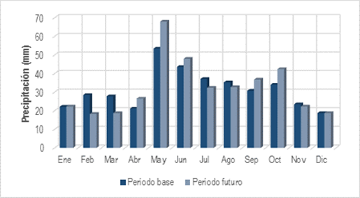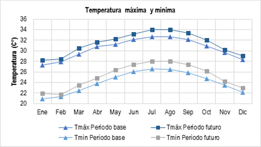 En la Figura 5 se presenta la gráfica comparativa de la temperatura máxima y mínima en el período base y las proyecciones del modelo Echam para estas variables en el período 2020-2050. Puede observarse que los resultados del modelo indican el aumento de las temperaturas respecto a las temperaturas en el clima base. Las proyecciones indican que la temperatura máxima aumentara en 1°C, mientras que la temperatura mínima aumentara 1,15°C.