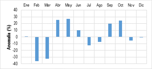 En la Figura 3 se presenta el comportamiento de la precipitación media mensual para el período base (1971-2000) y del período futuro a mediano plazo (2020-2050) bajo el escenario de emisiones de gases de efecto invernadero A2. Puede observarse que el comportamiento medio en este período es al aumento de las precipitaciones en los meses de abril-junio, septiembre y octubre; en resto de los meses la tendencia en a la disminución. Las disminuciones en las precipitaciones medias mensuales para el período analizado pueden ser observadas en forma de anomalía porcentual (diferencia porcentual entre el período futuro respecto al base) en la Figura 4.