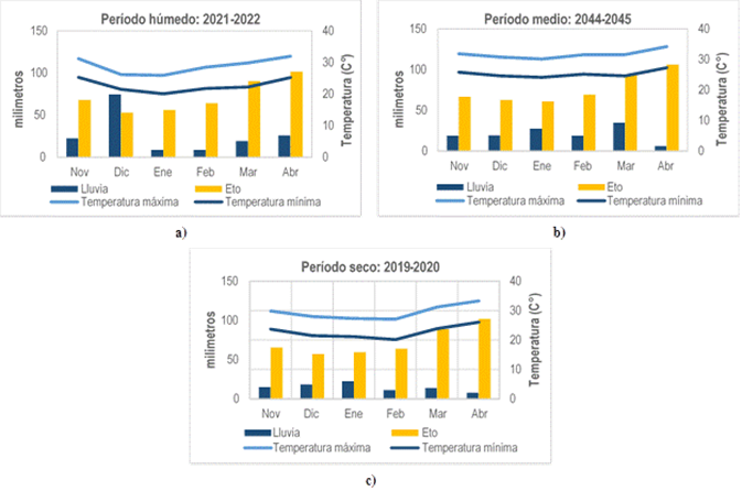 En la Figura 6 a) se presenta el comportamiento de las variables de temperatura, precipitación y ETo, para el escenario A2 en el período húmedo (2021-2022), en este caso el comportamiento de la temperatura varía desde los 20°C en el mes de enero hasta los 32°C en el mes de abril. El acumulado de la lluvia para este período es de 158,5 mm, produciéndose el valor más bajo del acumulado en el mes de febrero (8,5 mm) coincidiendo con la fase de desarrollo del cultivo. En el caso de la evapotranspiración de referencia se encuentra en un rango 52,7 mm en el mes de diciembre hasta 101,4 mm en el mes de abril.