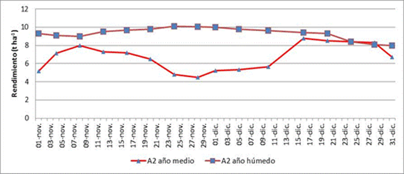 Para el año medio se presenta un máximo de rendimiento a partir de segunda quincena del mes de diciembre. Otro período de importancia se observa entre el 4 y 16 de noviembre, donde se pueden alcanzar rendimientos por encima de 7 t ha-1. Mientras que para el año húmedo se estiman rendimientos de hasta 10 t ha-1 si se siembra entre el 20 de noviembre y el 5 de diciembre.