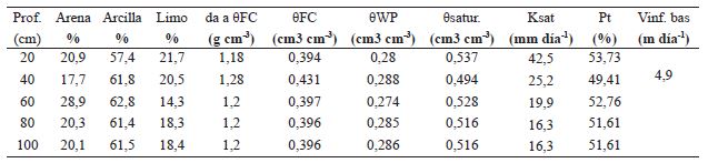 Según estos autores de acuerdo a su funcionamiento hídrico, el suelo presenta un comportamiento diferenciado en la capa de 0-20 cm con respecto a los valores de densidad aparente, el proceso de retención de humedad y de la conductividad hidráulica. A partir de los 40 cm hay una capa más compactada que diferencia estos procesos hidrodinámicos.