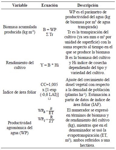 De acuerdo a lo reportado por Raes et al. (2009), el modelo AquaCrop consta de varias ecuaciones que, con datos de clima, densidad de población, características genéticas, tipo de suelo, nivel de fertilización y nivel de déficit hídrico, simulan el crecimiento y rendimiento del cultivo. En la Tabla 2 se muestran las ecuaciones que AquaCrop utiliza para el cálculo de biomasa y producción de grano.