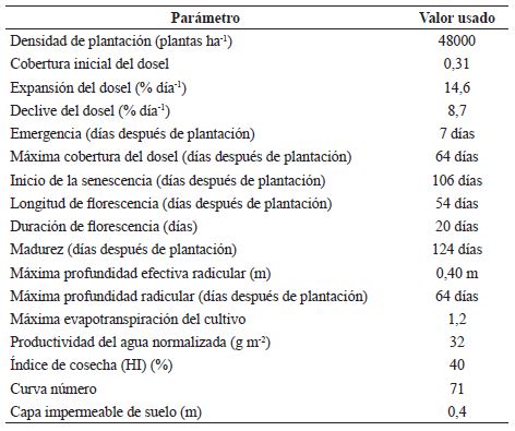 La cobertura del dosel vegetal al 90% de emergencia y el máximo crecimiento fueron 0,31 y 80%, respectivamente, y el coeficiente de decline del dosel por día fue estimado como 8,7%, valores que difieren de los originales calibrados en el modelo para maíz. Se presentan también los parámetros relacionados con la duración de las diferentes etapas de desarrollo del cultivo: la cantidad de días después de plantado el maíz para lograr la máxima cobertura, el comienzo de la floración y la senescencia 64, 54 y 106 días, respectivamente. El índice de cosecha (HI) considerado fue de 0,40, por ser el valor más común obtenido bajo condiciones óptimas de desarrollo durante la calibración del modelo. Este valor se encuentra en el rango (0,3 a 0,5) que propone Wani et al. (2012).