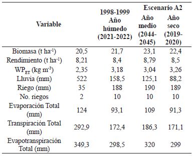 Si se aplica riego deficitario (eliminando 2 riegos antes de la floración, se reduce a 149 mm) en el año húmedo y bajo el escenario A2, los rendimientos se estiman en 5,56 t ha-1 y la biomasa 15 t ha-1, lográndose una productividad de 2,40 kg m-3, con reducciones con respecto al potencial hasta de un 26%. Este manejo del riego, unido a las escasas y mal distribuidas precipitaciones provocó agotamiento del agua en el suelo en casi todo el período de desarrollo del cultivo y marcados niveles de estrés, a los 60 días se alcanza un estrés del 100% inhibición de la expansión del dosel vegetal y 39% cierre estomático.