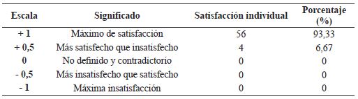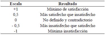 Para obtener el índice de satisfacción grupal (ISG) se partió de asociar los diferentes niveles de satisfacción de los encuestados con una escala numérica que oscila entre +1 y - 1, con los resultados siguientes: (Tabla 2):