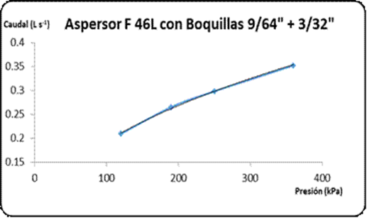 Con la información de la Tabla 1 se construyó la curva caudal-presión del aspersor de la cual se tiene la ecuación que rige el comportamiento del gasto en función de las presiones, resultando ser de Q=0,0129H0,4727 con un coeficiente de determinación de R2=0,9983; que se muestra en la Figura 1.