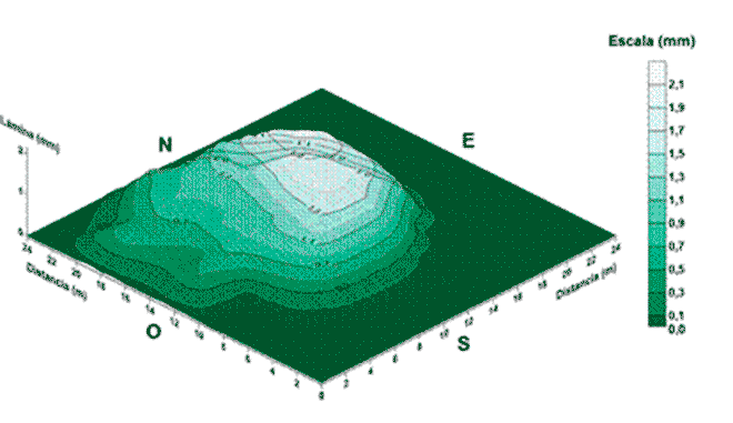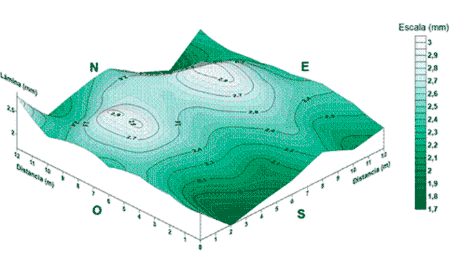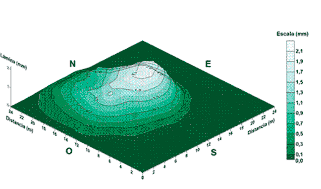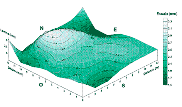 En la Figura 2 se muestra el patrón de distribución del agua aplicada por el aspersor individual, donde se puede apreciar la gran influencia que provoca tanto la dirección como la velocidad del viento. En la figura se aprecia como el reparto de agua incide mayormente sobre el cuadrante NN-O.