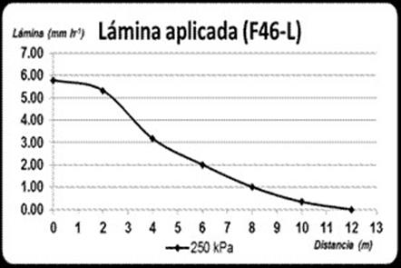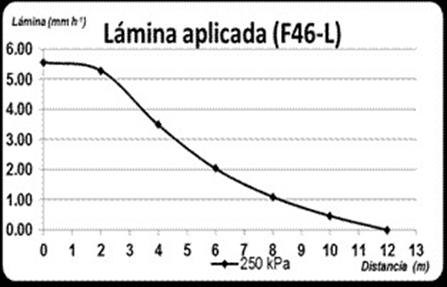 En las Figuras 4 y 5 se muestra la distribución de la lámina aplicada por el aspersor F46-L para la presión de trabajo, así como la distancia de alcance, en estas figuras se obtiene el radio efectivo con el 10% de la pluviometría media.