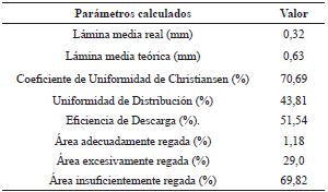 En la Tabla 3 se resumen los parámetros de calidad del riego obtenidos donde se aprecia que la lámina media real es inferior en 0,28 mm, mientras que el coeficiente de uniformidad de Christiansen es de 74,42% el cual se considera deficiente para el riego por aspersión semiestacionario según el criterio de Phocaides (2007), que plante valores mínimos entre 75% y 80%.