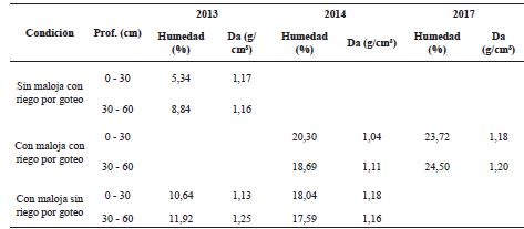 La compactación del suelo expresa el grado de resistencia del mismo al desarrollo de las raíces como consecuencia de la acción de fuerzas compactantes como son el paso de máquinas agrícolas u otros factores, provocando el aumento de la densidad aparente, de la resistencia mecánica y disminuye la porosidad y por tanto los efectos negativos en el rendimiento agrícola (Coronado et al., 2017). El cincelado, constituye una práctica, utilizada para romper capas compactadas a menor profundidad (aproximadamente 15-25 cm). Después de cuatro años (Tabla 5) manteniendo la maloja y el riego, la humedad del suelo es mucho mayor y el grado de compactación (densidad aparente) no supera (en los primeros 30 cm) los niveles críticos para el cultivo de la caña de azúcar (1,17 g/cm3), según resultados obtenidos por Albán, 2009 y Arcia (2016).