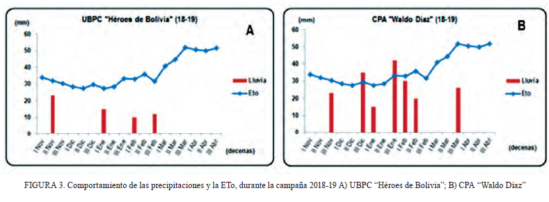 Durante la campaña 2018-19 la lámina de agua suministrada al cultivo permaneció en el rango de 14,5 mm para las tres áreas en los inicio del ciclo de vida y los 23 mm en los momentos punta, es de interés destacar que las mismas fueron suficientes para elevar la humedad hasta el límite superior de agua disponible (0,394 cm3 cm-3).