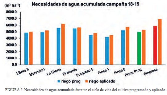 Cuando analizamos las necesidades de agua acumuladas para el riego programado y el aplicado por la empresa como se muestra en la Figura 5, al final del ciclo del cultivo para suplir las necesidades de riego siguiendo el criterio de la programación se demandan 3600,0 m3 ha-1, mientras que con la programación tradicional (aplicado por la empresa) son necesarios 5000,0 m3 ha-1, evidentemente existe una reducción de 1400,0 m3 ha-1 a favor de la programación.