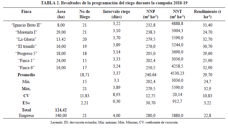 En la Tabla 2 aparece el comportamiento de la programación del riego en las entidades estudiadas durante la campaña 2018-19 , el número de riego se mantuvo en el rango de 15 a 21, también en dependencia de la zona, el intervalo de riego se comportó entre los 3,10 y 3,89 días en función de las fechas de siembra y la evapotranspiración de referencia. En la misma se observa además como la norma neta parcial (NNP) promedio varió entre 232,8 m3 ha-1 en la zona Sur y 250,5 m3 ha-1 en la zona Norte, en correspondencia los rendimientos oscilaron entre 24,7 t ha-1 y 32,9 t ha-1.
