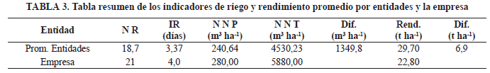 Por otra parte, los rendimientos obtenidos en el riego tradicional son inferiores a los alcanzados con la programación del riego en 6,9 t ha-1 para las entidades de estudio, lo que representa un aumento del rendimiento agrícola en un 23,2% a favor del riego programado entre todas las entidades objeto del análisis.