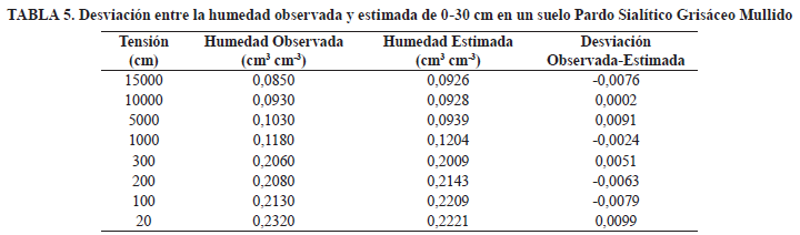 Ruiz (1997) planteó que la utilización de las curvas de retención de humedad determinadas en laboratorio a partir de muestras inalteradas, pueden considerarse como un resultado exitoso, teniendo en cuenta lo trabajoso que resulta y el tiempo que lleva la determinación de las curvas “in situ”; como se muestra no se observan diferencias significativas entre la humedad obsevada en el laboratorio a partir de muestras inalteradas y la estimada por el sofware para ninguna de las tensiones evaluadas en las capas estudiadas (Tablas 5, 6 y 7), la que refleja ,en algunos casos, que los datos estimados se subestimaron sistemáticamente, no siendo las diferencias en ningun caso superior a 0.