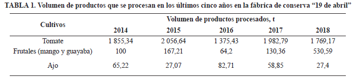 En la Tabla 1 se presenta el volumen de productos procesados en los últimos cinco años. Como se puede apreciar el mayor porcentaje corresponde al cultivo de tomate, del cual se procesan de forma conjunta diferentes variedades, todas producidas en la provincia.