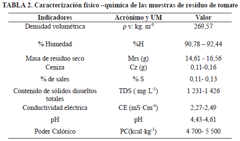 En la Tabla 2 se presenta la caracterización físico-química de las muestras de residuos de tomate. En ella se puede apreciar el porcentaje de humedad de la misma, el cual verifica un contenido elevado de las muestras para este cultivo según estudios realizados por (Rojas et al., 2019).