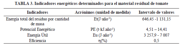 Para la estimación del potencial energético de las muestras de mezclas de tomate agroindustrial se utilizaron los indicadores energéticos cuyos intervalos de valores son presentados en la Tabla 3.