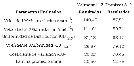La máquina Urapivot 3-2 a pesar de esta tener un coeficiente de uniformidad de 79,10% muy cercano a 80% pero una lámina correcta originó la obtención de un rendimiento de 27,41 t∙ha-1 valorando resultados de satisfactorios.