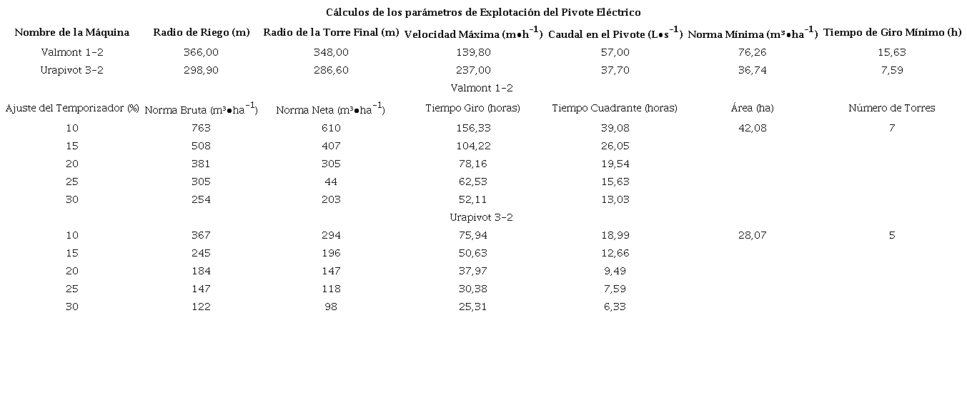 Al determinar la velocidad real de la última torre se tiene que para la máquina Valmont 1-2 es de 2,33 m∙min-1 que equivale a 139,80 m∙h-1, valor que se utilizó en el software Pivote de García (2006), para dar los resultados de los parámetros evaluados. Los parámetros de explotación calculados como aparecen en la Tabla 2 son los parámetros reales que se deben aplicar y mantener en las estaciones de bombeo para la realización correcta del riego, partiendo del cálculo de la velocidad real, lo que da, el ajuste preciso a cada máquina, estos parámetros son: norma de entrega bruta (m³ ha-1), norma de entrega neta (m³∙ha-1), tiempo de giro (h), tiempo por cuadrante (h) así como los porcientos de trabajo para la entrega de las normas según la edad del cultivo y su profundidad radical en el momento del riego.