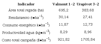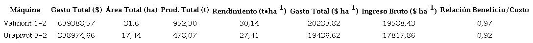 La relación beneficio/costo obtenida en la máquina Urapivot 3-2 fue de 0,92, mientras para la Valmont 1-2 fue de 0,97, ambos valores menores que la unidad, lo que indica la no rentabilidad en la campaña, a pesar de haber obtenido buenos rendimientos, con valores de 27,41 y 30,14 t∙ha-1.