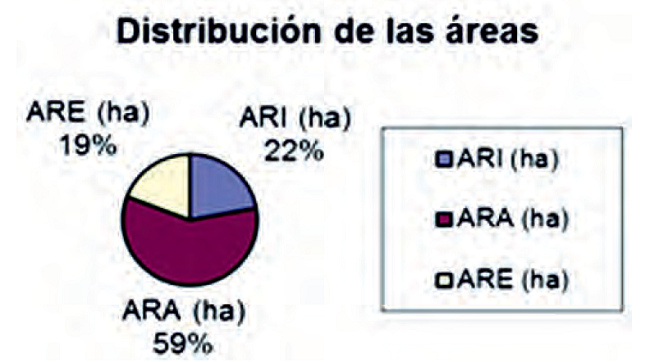 En las Figuras 1 y 2 podemos observar el comportamiento de la distribución de las áreas para los sistemas Valmont 1-2 y Urapivot 3-2; donde un aumento del área adecuadamente regada hace que disminuya el valor del área insuficientemente regada y la excesivamente regada, lo cual justifica el valor del coeficiente de uniformidad alcanzado. Área total de ambos sistemas son de 42,08 y 28,07 ha respectivamente.