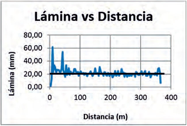 En la Figura 4, se muestra la distribución de la lluvia a lo largo de la máquina, en la cual podemos observar, que al igual que la máquina anterior, en los primeros 100 m se producen excesos por encima de la lámina media, causados por el mal estado de los emisores y por los salideros presentados.