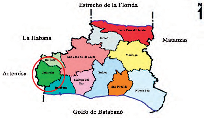 La zona de estudio (Empresa Agropecuaria “19 de abril”) Figura 1, se encuentra en el municipio de Quivicán, ubicada en el centro sur de la provincia Mayabeque. Limitado al este con el municipio cabecera San José de las Lajas y al norte con el municipio de Bejucal; al oeste con la provincia de Artemisa (municipios de San Antonio de los Baños y Güira de Melena), y al sur con el Golfo de Batabanó.