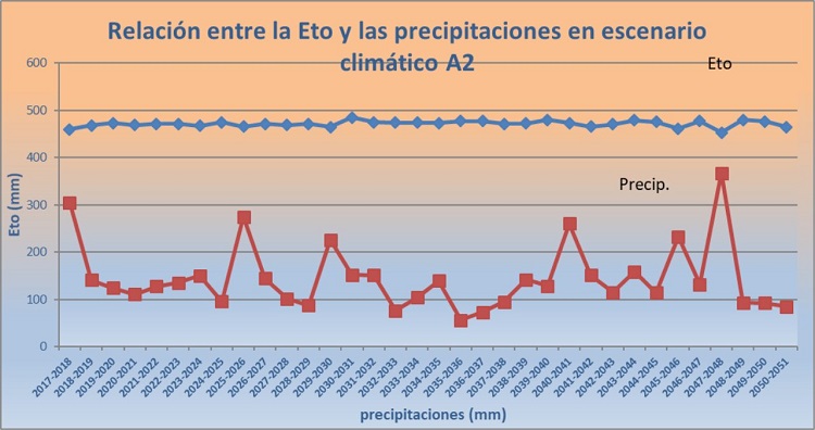 La tendencia de las precipitaciones en la zona de estudio es a ser más reducida y variable hacia los años 2050 en un rango entre 56 y 366 mm, con una media de los 33 años de estudios de 145 mm, mientras que la ETo se mantiene más estabilizada durante todo el período, por encima de los 400 mm, lo cual permitirá realizar estrategias para la planificación y uso eficiente del agua para el riego