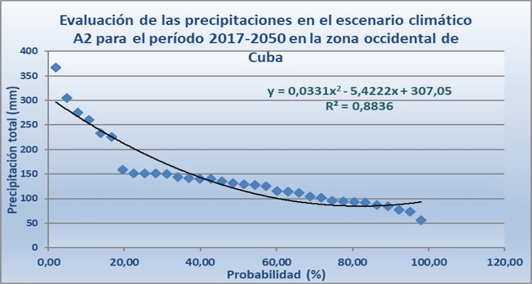 La Figura 2 refleja el comportamiento de las precipitaciones y la probabilidad de ocurrencia asociada a una ecuación polinómica, y=0,0331x2-5,4222x+307,05 con R² = 0,8836. De la propia figura, es preciso señalar que de todos los años caracterizados (33), se tendrán 16 de ellos entre normales, medio secos, o secos y muy secos, lo que confirma lo planteado por Planos et al. (2012 y 2014) sobre la variabilidad del régimen hídrico en Cuba y la necesidad de asegurar la producción con el riego, según las normas netas de los cultivos estimadas a futuro Duarte et al. (2017).