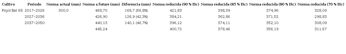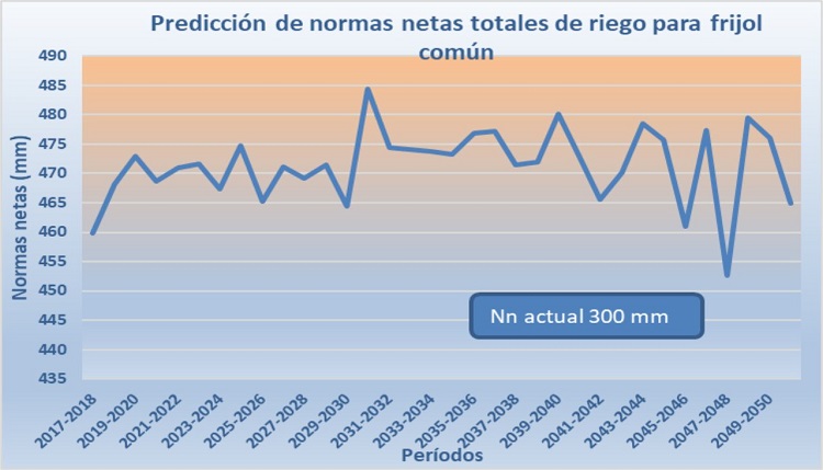La predicción de las normas netas totales de riego del frijol, estimadas en el período 2017-2050, se promedian en 445, 24 mm con incrementos en más del 40% en relación con la norma neta actual, cuestión de suma importancia a tener en cuenta por la poca disponibilidad de agua que se predice según el cambio climático, con independencia de la incertidumbre de los métodos empleados.