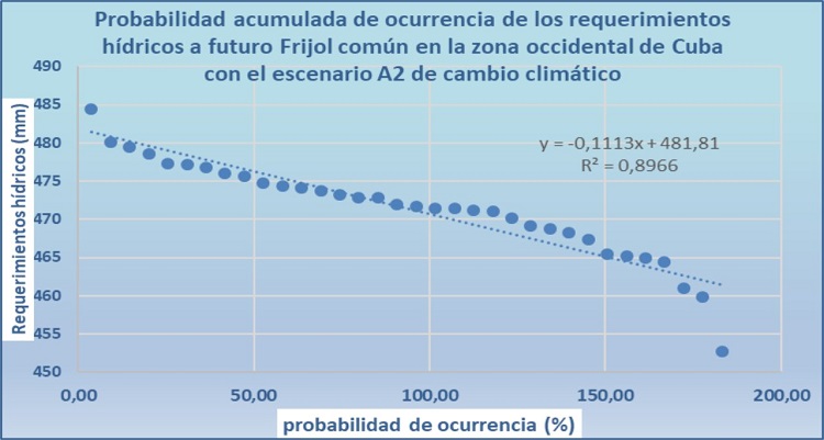 Se aprecia en la Figura 4, la probabilidad de ocurrencia de los requerimientos hídricos, vistos como las normas de riego estimadas desde el 2017 al 2050 asociada a la ecuación y = -0,1113x + 481,81 R² = 0,8966. Según el análisis realizado para la situación de variabilidad climática y efectos de sequía, con poca disponibilidad de agua cada 5 años, 4 de ellos se cubrirán con la norma 477,3 mm para el diseño de riego, siendo muy elevada. El comportamiento futuro estimado para la entrega de agua para el frijol, hace que se piense en un reordenamiento en la planificación y manejo del agua en el cultivo en función de la disponibilidad de agua en cada año. Los resultados coinciden con los estudios de Conde (2011) para América Latina y el Caribe sobre la probabilidad de que los recursos hídricos se vean disminuidos (entre el 10% y 30%) y la necesidad de hacer un ajuste de los mismos para la producción agrícola.