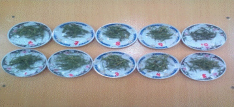 Luego el producto cosechado fue trasladado al laboratorio, donde las plantas fueron troceadas completamente en pedazos de entre 20 mm y 25 mm, posibilitando así el aumento la superficie de contacto entre el aire caliente y las muestras. Seguidamente, teniendo en cuenta la inevitable diversidad fisiológica, fueron colocadas 10 muestras de 20 g cada una en recipientes debidamente identificados (Figura 1), para lograr mayor representatividad en los resultados finales del experimento.