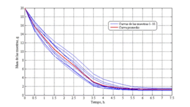 En la Figura 2 se muestran los resultados obtenidos a partir de la realización del experimento. La misma consistió en el cómputo cada 30 minutos de la masa de las muestras y su promedio. Una simple inspección visual, permite apreciar que, con posterioridad a las cinco horas de secado de las muestras, la pérdida de masa (y, por ende, de humedad) de las mismas parece no ser significativa.
