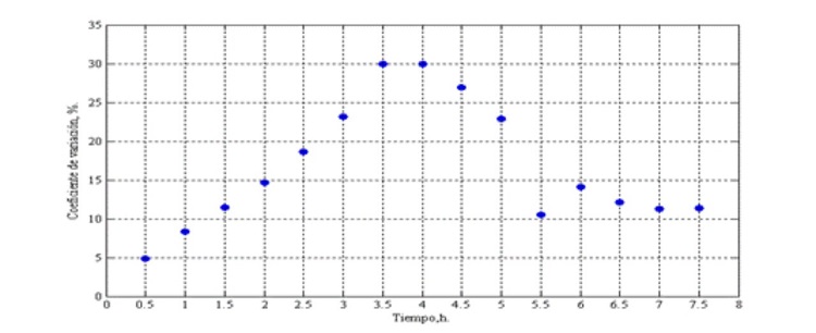 Con el coeficiente de variación de las masas de las muestras en cada intervalo de medición no sucede lo mismo. Como se puede apreciar más claramente en la gráfica de la Figura 3, en el intervalo de tiempo comprendido entre las 3,5 h y las 4 h se produce un pico de este estadígrafo, que refleja la máxima variabilidad en la masa de las muestras.