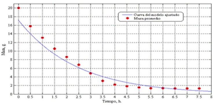 Adicionalmente, se obtuvo un modelo de regresión exponencial, a partir de los valores del promedio de las masas de las muestras. En la Figura 4 se muestra la gráfica del modelo de regresión ajustado. La ecuación del modelo ajustado es: