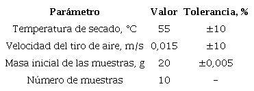 Por ello, se establecieron los valores de los parámetros bajo los que se efectuó el experimento, en condiciones similares a las del secado solar, recreadas en el laboratorio a partir de los parámetros tecnológicos recogidos y precisados en la Tabla 1.