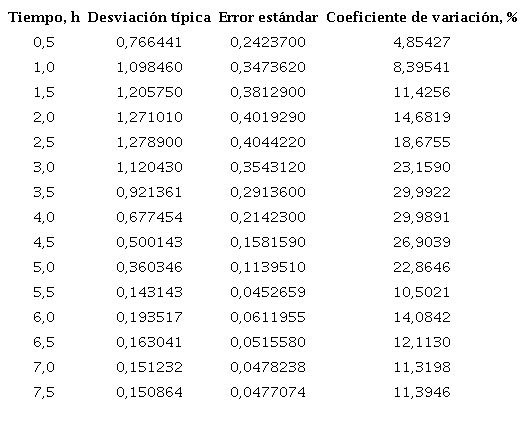 En la Tabla 2 se muestra el resumen estadístico de los resultados experimentales. Como se puede apreciar, tanto la desviación típica como el error estándar de las masas de las muestras en cada intervalo de medición, no poseen diferencias significativas respectivamente entre sí.