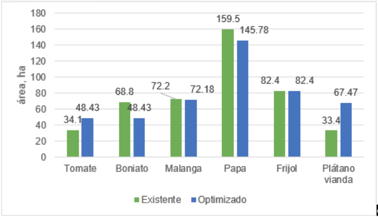 Analizando la cantidad de hectáreas a sembrar según el plan de producción existente y optimizado (Figura 1), se puede ver que hubo variaciones en la cantidad de área propuesta a sembrar de: tomate (+14,33 ha), boniato (-20,37 ha), papa (-13,72 ha) y plátano vianda (+34,07ha) manteniéndose la misma área a sembrar de malanga y frijol. Esto se justifica porque con la disminución del área a sembrar de papa y boniato, teniendo en cuenta los rendimientos de estos cultivos en la CPA, se cumplen los compromisos de la misma y se pueden aumentar las áreas a sembrar de tomate y plátano vianda que dan mayor beneficio económico a la CPA, que como se menciona anteriormente se traduce en una ganancia de 7 064,716 peso.